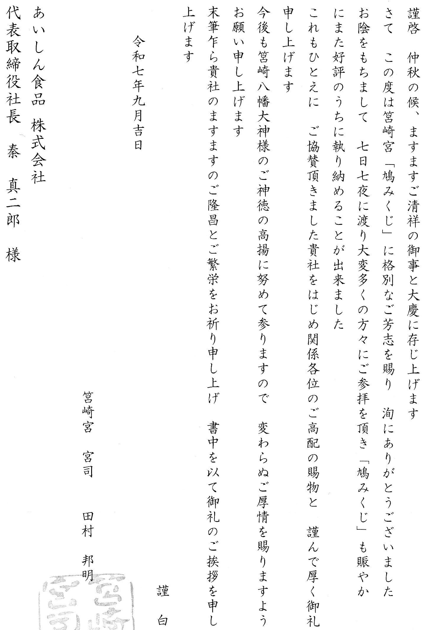 あいしん食品からのお知らせ HOME | お知らせ | 2025年10月6日 筥崎宮「鳩みくじ」 【筥崎宮「鳩みくじ」協賛】 本年度も筥崎宮「鳩みくじ」へ協賛させて頂きました。多くの皆様のご参拝ありがとうございます。 トップぺージ あいしん取扱い商品 PB商品 スイーツプロジェクト おせち関連商品 海外プロジェクト あいしんの強み 企業情報 企業概要 企業理念 安全・安心対策 お問合せ 採用情報 あいしん食品特集 ,,, あいしん食品株式会社〒814-0032 福岡県福岡市早良区小田部6丁目13‐21TEL:092-851-8788FAX:092-851-8774